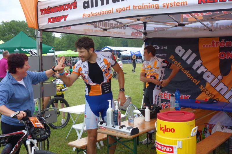 V den závodu přišel usměvavý šťastlivec k oranžovému stánku Alltraining.cz na minutu přesně a společně s trenéry se pustili do práce. Taktické rady, doporučení k výživě v průběhu závodu, prostudování profilu nad mamkou trati a samotné předání gps sporttestru Garmin a samotné výživy od firmy Nutrend. To vše patří k oné báječné výhře.